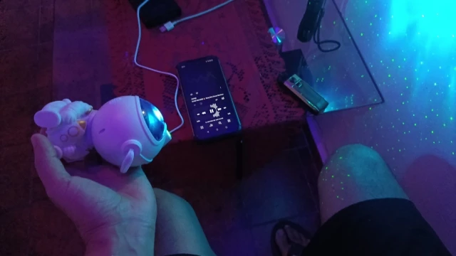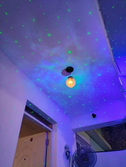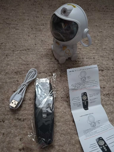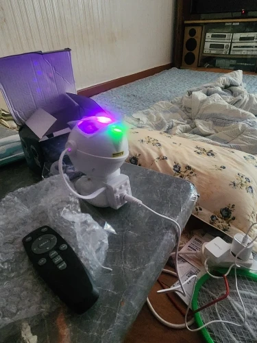 The remote control works well and there are no batteries included. It takes two 3A batteries. Everything works normally except for the self-charging battery; it only works when connected with a cable. There is also a switch on the body. The picture brightness is good and there is movement, but since it's a laser light, placing it in a low area causes light to come into the eyes when operating, so it should be placed higher than eye level to operate. I like it.